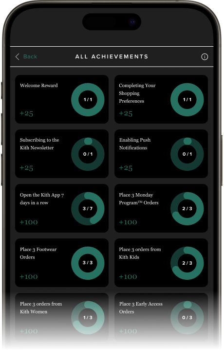 Earn points on activities online, in-store, and on the Kith App.